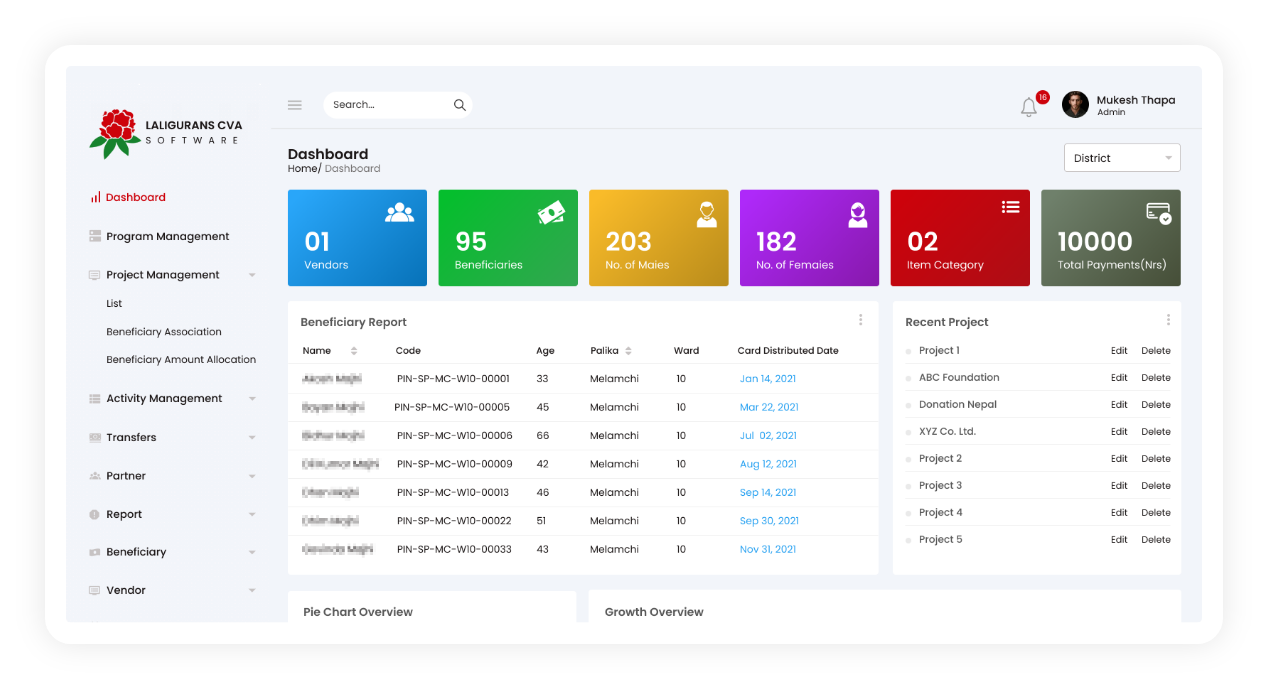 Laligurans web panel has multiple reporting options that can generate disaggregated reports in real time using multiple filter options. We also provide real-time Power BI dashboards to visualize the progress of project in terms of beneficiary reached and amount disbursed.